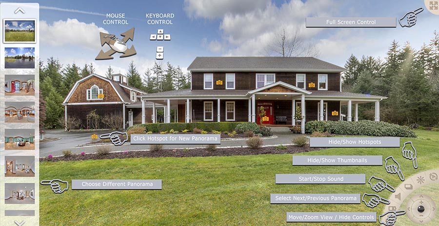 Clean no fuss tour with ability to hide all hotspots/controls. |